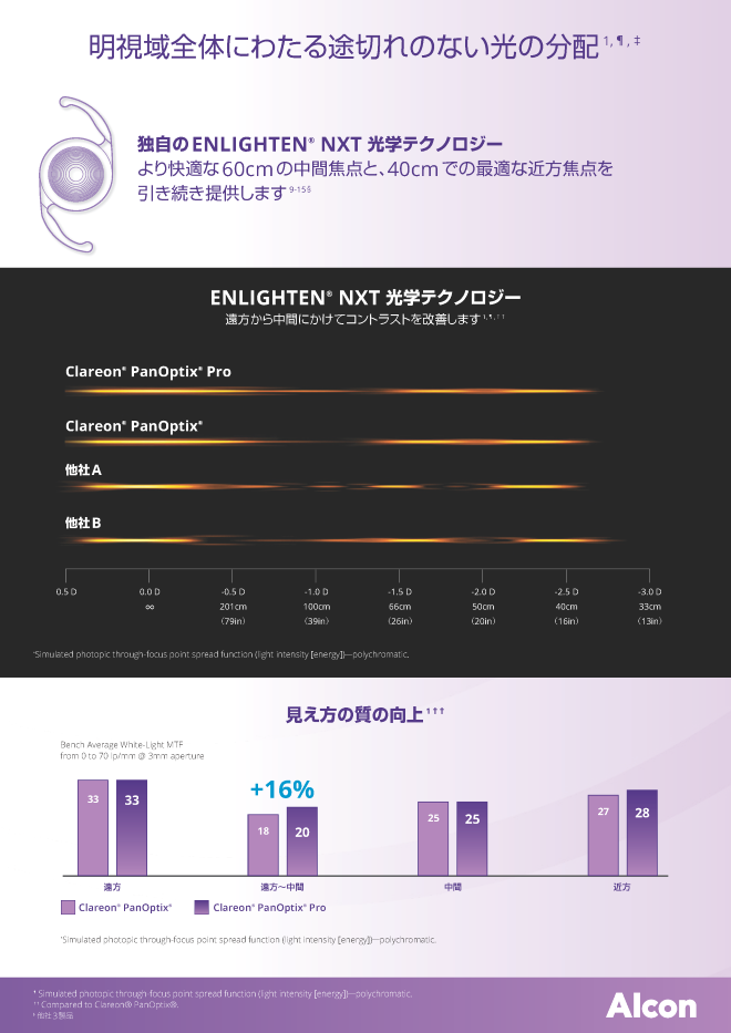 ・遠方焦点と中焦点の間の光学的コントラストを16%向上し、遠方から近方まで切れ目がなく、より明るく鮮明な見え方を提供します。